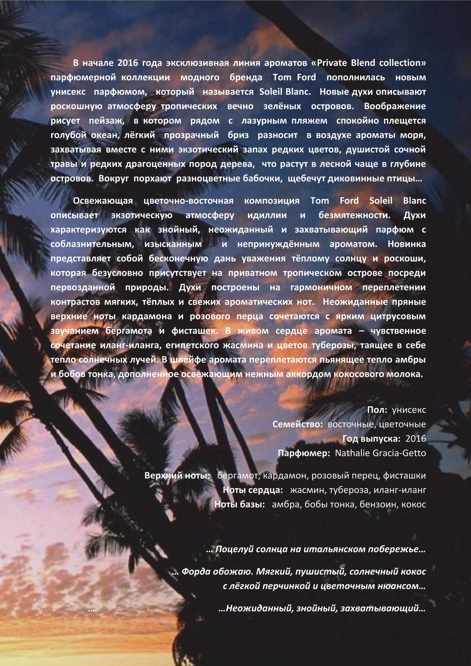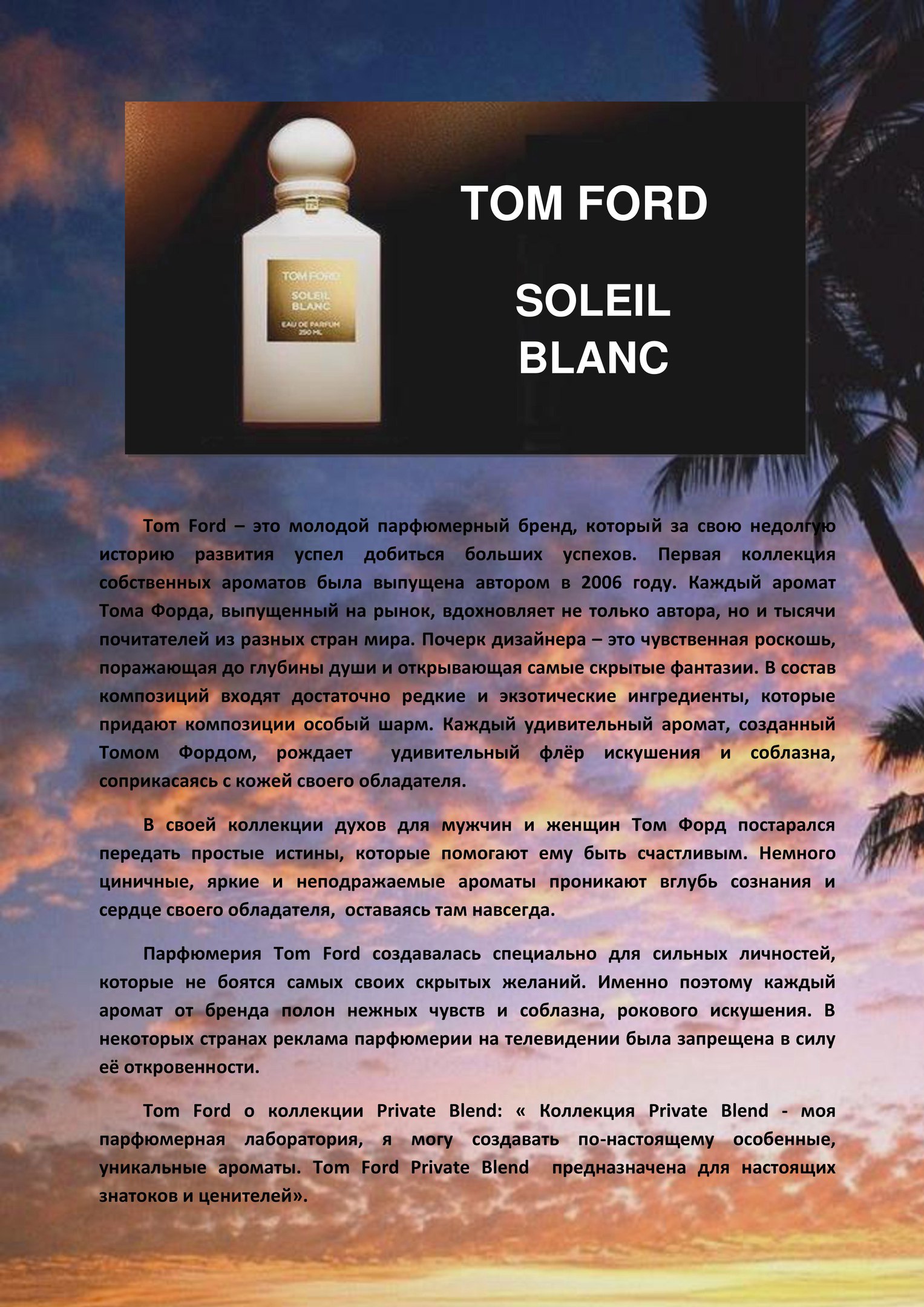 В основную коллекцию поступил аромат 2016 года - SOLEIL BLANC TOM FORD. Этот аромат даёт те ощущение, которых нам не хватает - солнце, тепло, хорошее настроение. "У меня всё отлично!" - у Вас будет такое состояние.
